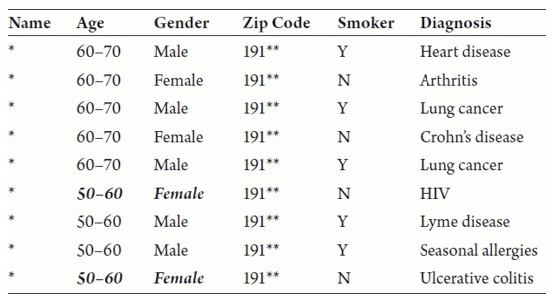 As an example of an attempt to publish anonymous data, let’s go back to the 1990s when a group in Massachusetts decided to publish a dataset of hospital visits to help researchers study health trends. To avoid leaking potentially sensitive data, they removed information that uniquely identified individuals such as their name, address, and social security numbers. However, they felt like they should still include broad demographic data like sex, date of birth, zip code to help researchers.