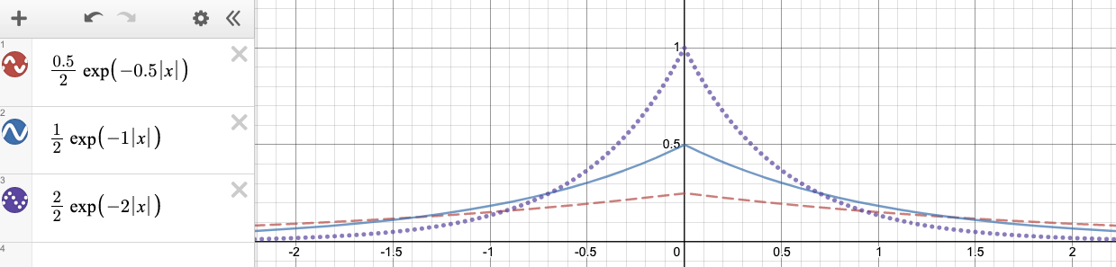 So much noise do we need to add to make sure our analysis result respects \(\varepsilon\)-differential privacy? It turns out that there is a well defined formula for this using a concept called the Laplace Distribution. You don’t need to understand the details of this distribution but that it’s a random number generator that outputs values; it’s somewhat similar to a normal distribution (or “bell curve”) in that some values near the center or more likely, but the shape of it looks slightly different. If you’re curious, the formula for the distribution for some parameter \(\varepsilon\) is \(f(x) = \frac{\varepsilon}{2}e^{-\epsilon |x|}\). The graph below shows the likelihood of seeing particular values for settings of \(\varepsilon= 0.5, 1, 2\).