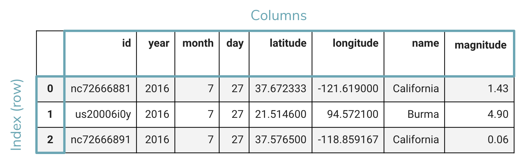 We also saw we can use a mask to select which subset of the rows we want by filtering our data to rows that have some specific value. For example, if we want to find all the earthquakes in California from 2016, we would write