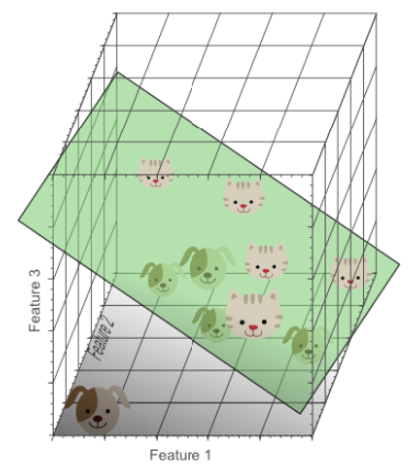 In the image below, we show an example of what a model to classify cats and dogs is trying to do. The features describing each image put the examples in a “feature space”, and the learning algorithm chooses a model that acts as a separator between dog images and cat images in this space. In the picture below, the green plane is the learned model. You, as the expert on the task you are trying to get the machine to learn, come up with a set of features to describe each example.