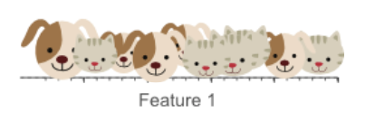 Consider the picture below showing examples of cats and dogs drawn in a feature space that just uses a single feature (e.g., how many red pixels are in the image). You can probably tell if we use this as the only feature, it will be quite difficult for the model to tell them apart. There isn’t a good separation between the dogs and cats in this feature space, so the learning algorithm will probably struggle to learn a model that separates them well.