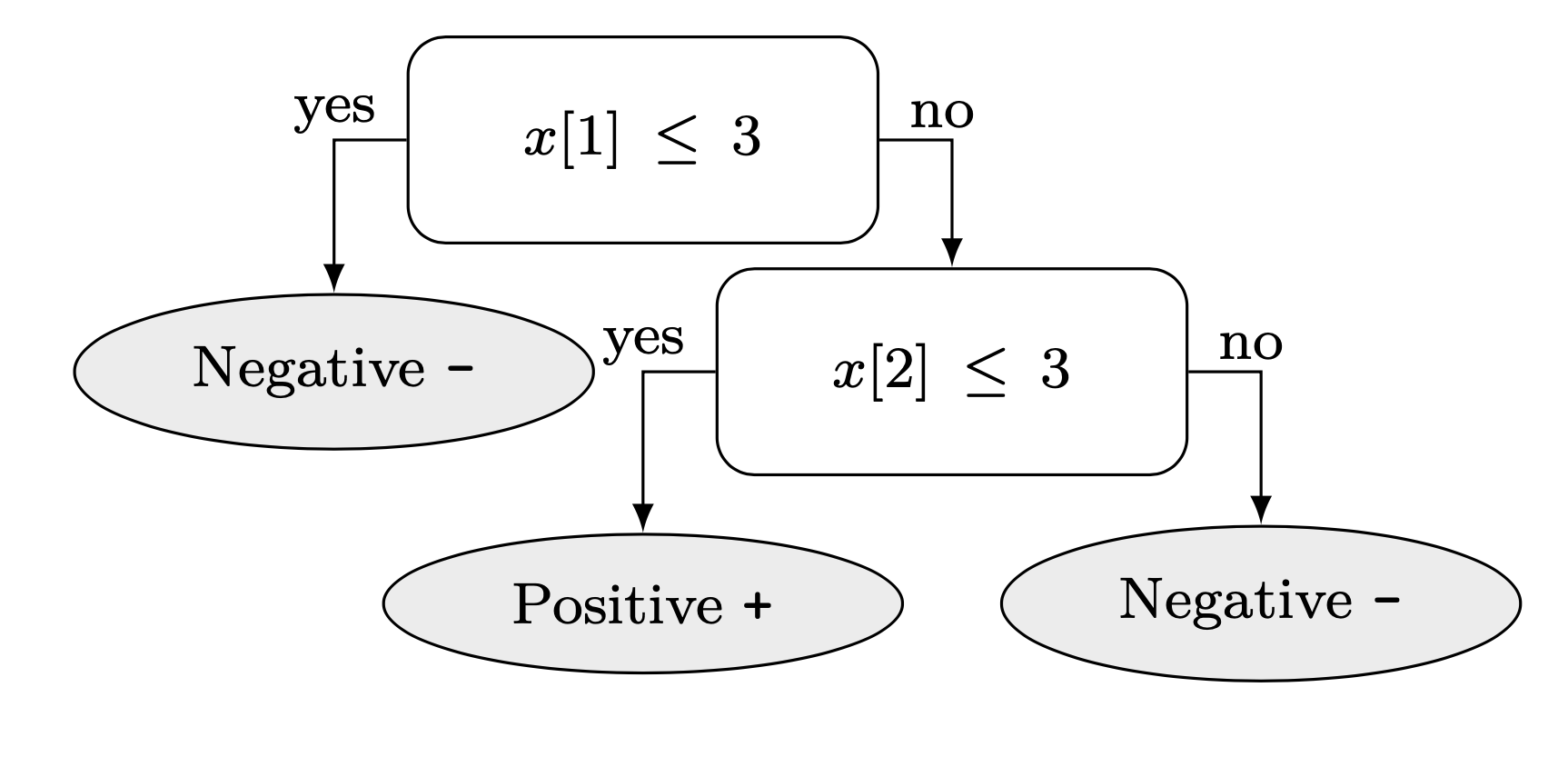 Consider the following decision tree (remember, left means true and right means false). Instead of giving the features names, we use generic names x[1] and x[2] .