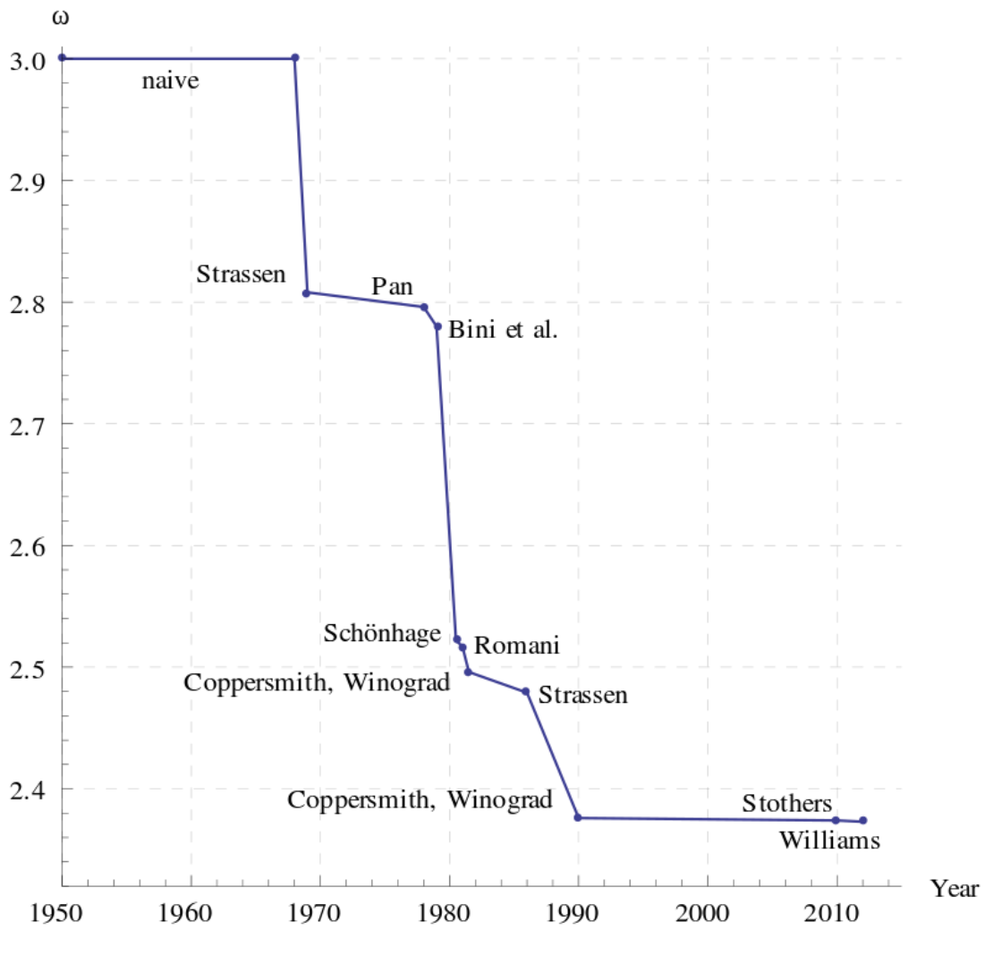 This operation is so important in computing in science, \(\mathcal{O}(n^3)\) does not suffice for many modern applications where \(n\) is large. Many researchers have spent their careers trying to find asymptotically faster algorithms. In the graph below, we show the progress on finding algorithms that scale faster than \(\mathcal{O}(n^3)\). The x-axis shows years and the y-axis shows \(\omega\) which represents the exponent in \(\mathcal{O}(n^\omega)\).