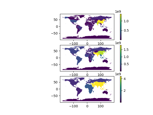 Write a program in main.py that reads in the world dataset and makes a plot containing three axes in one figure. The top-most plot should plot the population (column POP_EST ) by country (the original data format). The middle plot should plot the population aggregated by the sub-region (column SUBREGION ). The last plot should plot the population aggregated by the continent (column CONTINENT ).