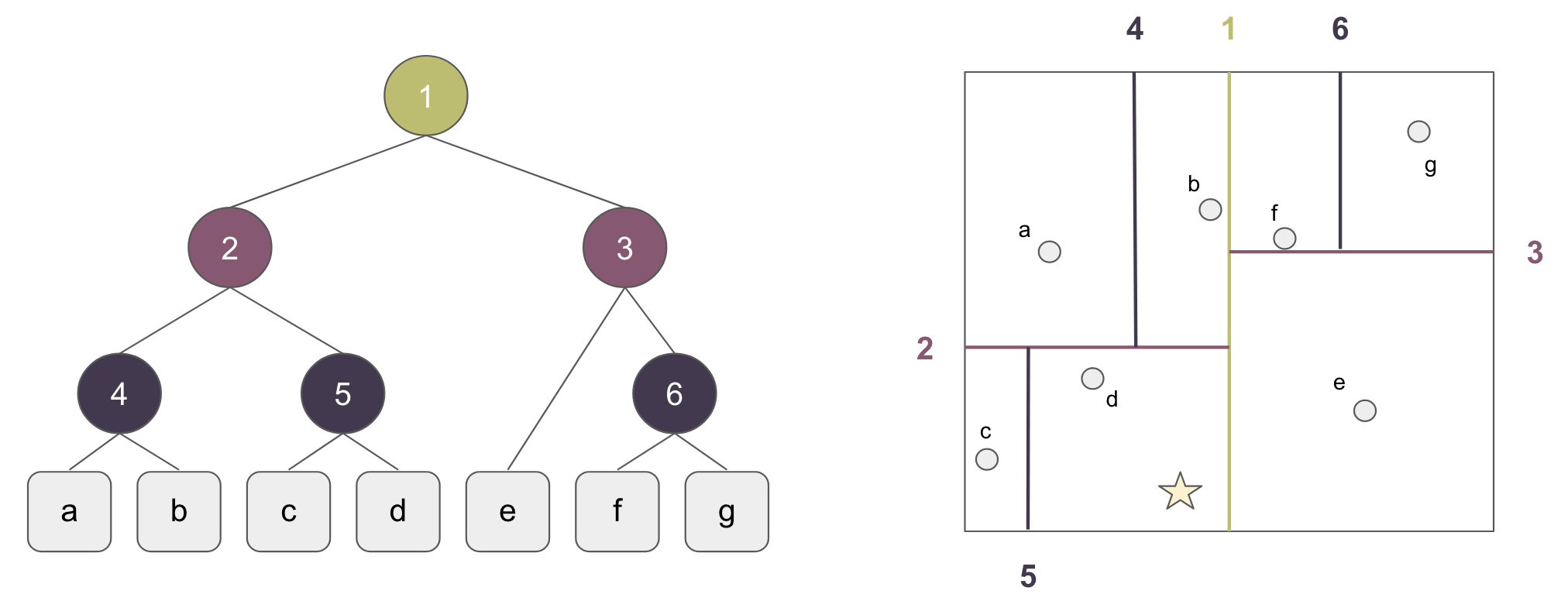 Consider the KD-tree for a spatial index we saw in the lesson reading shown again in the picture below. Consider if we were to search for the query point that is the star shown in the image (you can click on it to see a larger version).