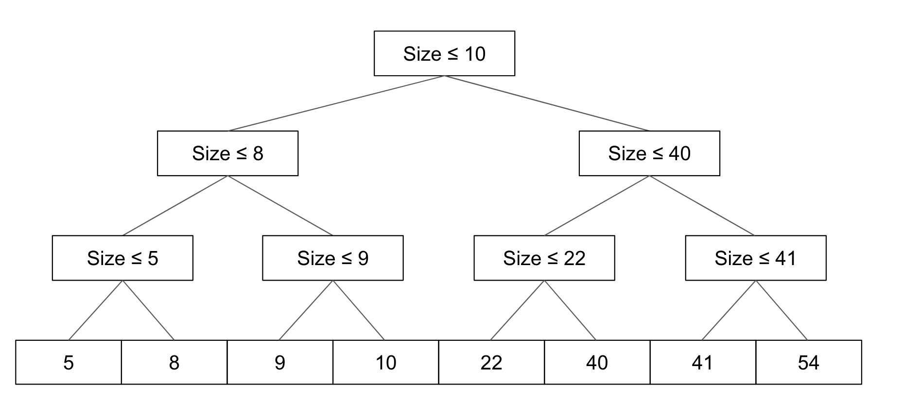 Consider the following sorted list of values shown in the image below. Suppose we have built a binary search tree index on this data and want to figure out how many steps to see if the value 21 is present in the dataset. We will count a single step as counting a node in the tree index for <= or comparing the final value in the list for if it equals the query value; this means you will count the number of nodes in the tree you visit plus one extra step for checking the value you find in the list.