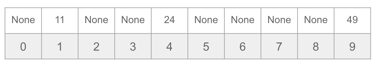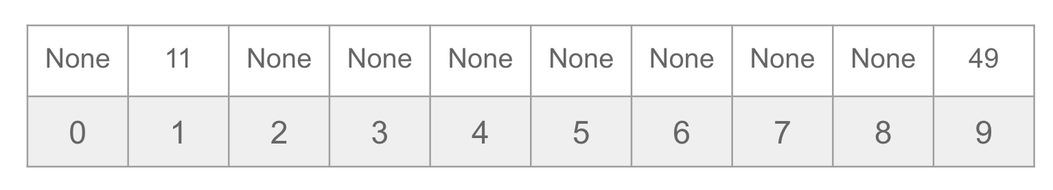 The hash function itself will be a cheap operation (\(\mathcal{O}(1)\) time). Accessing the value in a list for a given index is also \(\mathcal{O}(1)\) time, so we can find the value 49 in \(\mathcal{O}(1)\) time!