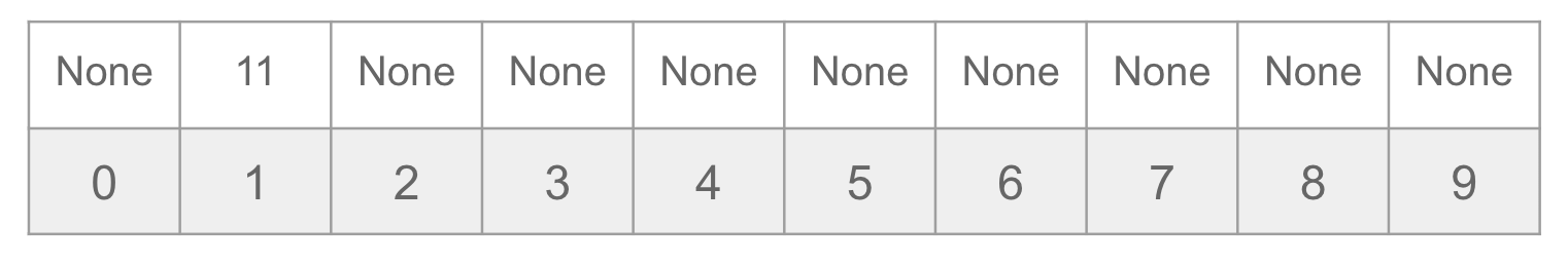 Since we are adding the number 11 , its hash value will be 1 (because 11 % 10 == 1 ). We will store the value 11 in index 1 .