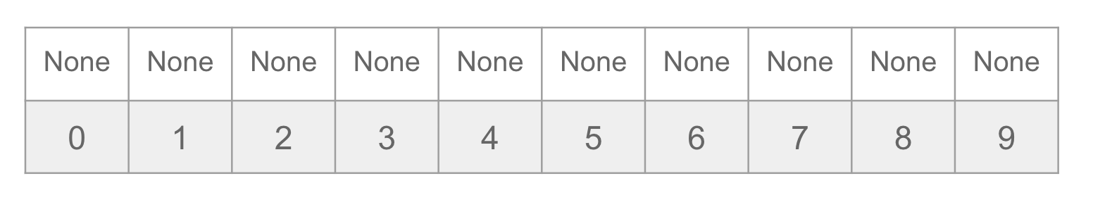 From the big idea above, we start by making a large list called a hash table that has many places to store values. We make the table start with size 10 and since there are no values in it yet, it corresponds to the empty set.