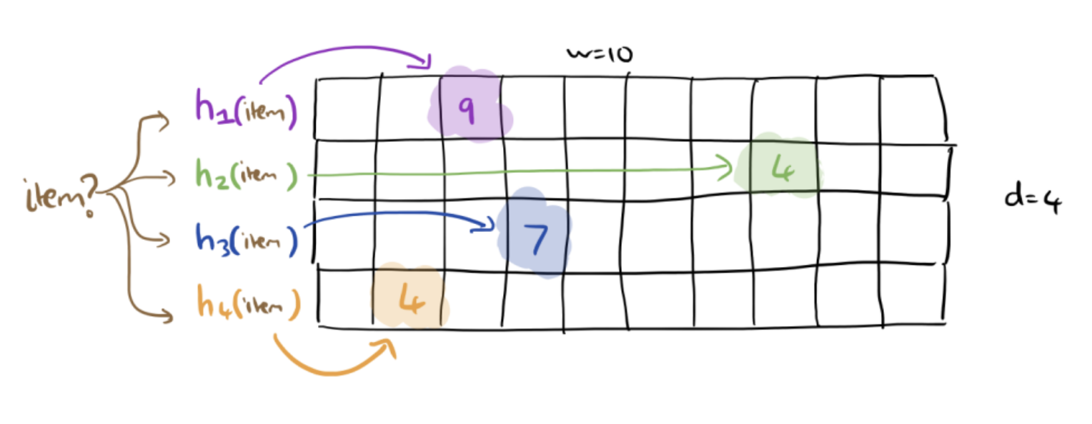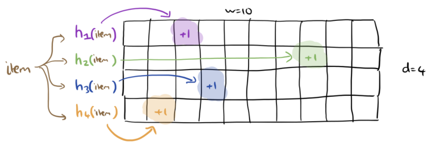 This idea of using a data structure to approximate information about a dataset is called sketching . With a sketch, we get a loose idea about the data without needing to have all the particular details. With a sketch, these counts will be approximations of the true counts. As we mentioned before, errors will only come from collisions so one way to reduce the errors could be to use a better hash function and a larger hash table. An incredibly clever idea that works well in practice takes an entirely different approach: use multiple hash tables!
