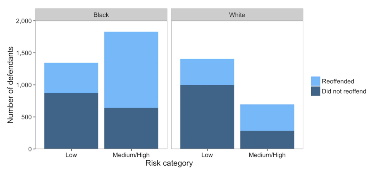 ProPublica (a non-profit newsroom) analyzed the results of COMPAS scores and concluded that the system was biased against people of color. In particular, they found that the system was more likely to predict a higher recidivism risk for black people than white people. Northpointe countered ProPublica’s findings by claiming that their scores were accurate in the sense that if they predicted a score of 9 for anyone (regardless of race), there was a 90% chance they would recidivate.